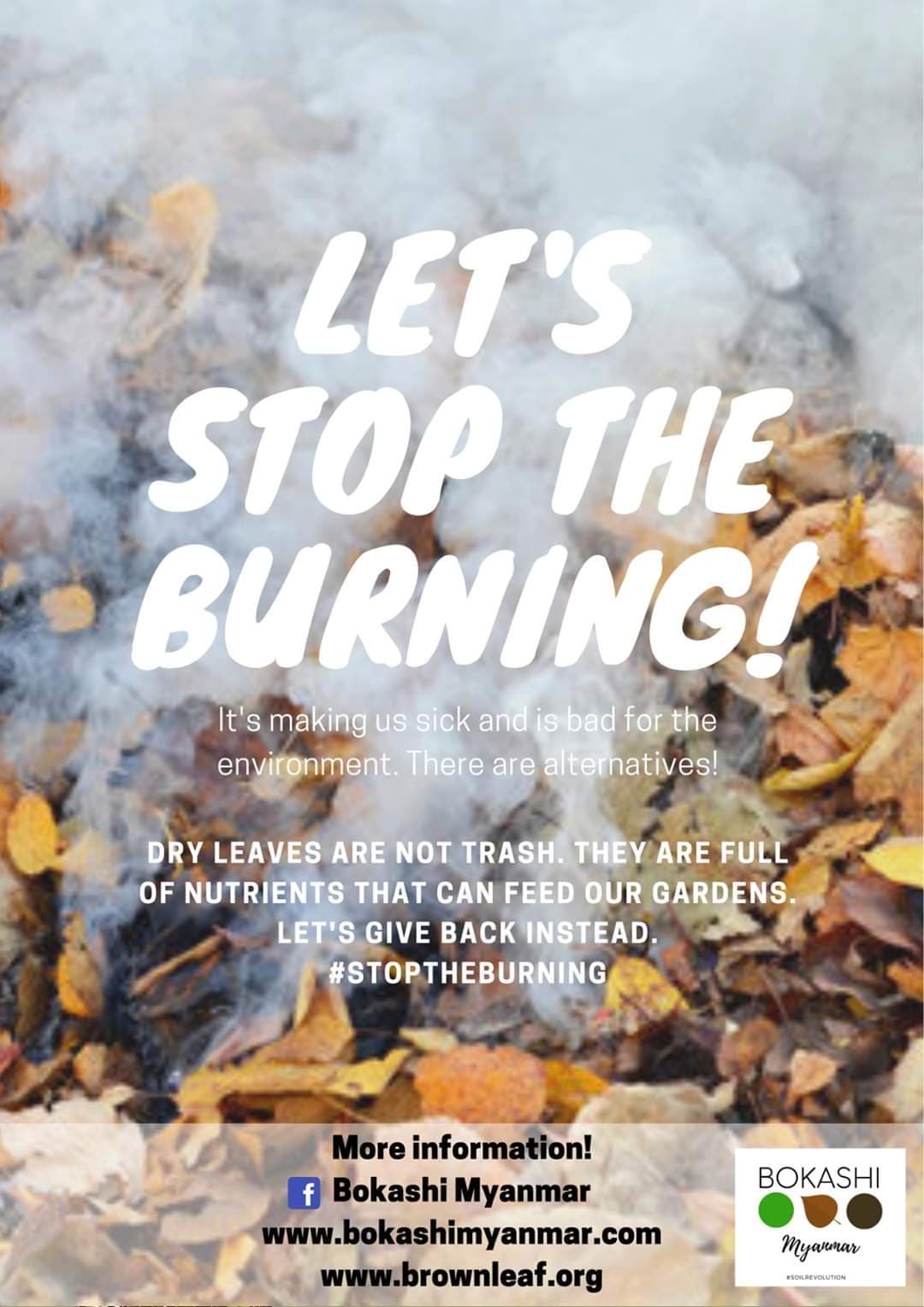 In Yangon people are burning dry leaves everywhere, in homes, gardens and on official premises. The dry leaves are often burned with plastic waste. Outside the city, crop residues are being burned after the paddy harvest.